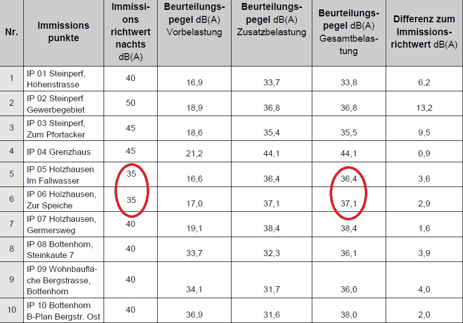 Das stimmt so nicht! Auch von Bottenhorn und von Steinperf wird man die Anlagen sehen und ggf. auch hören. Und Schlagschatten könnte es auch in den anderen Dörfern geben. BE plant weitere Windparks an der Endbacher Platte mit Beeinträchtigungen für Bad Endbach, Günterod, Hartenrod, Hütte sowie am Schönscheid mit Beeinträchtigung von Hartenrod, Schlierbach, Günterod allein in unserer Gemeinde. Und die Bottenhorner, Dernbacher und auch Hülshöfer leben jetzt seit annähernd 20 Jahren mit Windrädern direkt vor der Haustür. Dennoch ist die größte Immission in Holzhausen zu erwarten.